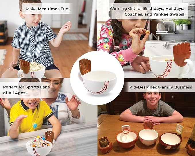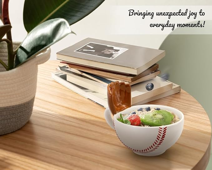 - Big Funny Mug – Interactive ceramic baseball ice cream/cereal bowl or mug, with glove. Fun for tossing toppings onto ice cream, cereal into milk or your favorite snacks.
