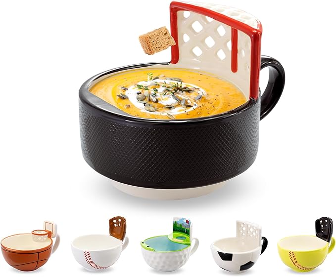 - Big Funny Coffee Mug – Interactive ceramic hockey cereal/soup/rice bowl with a net. Fun for tossing crackers or vegetables into soup, cereal into milk or your favorite snacks.