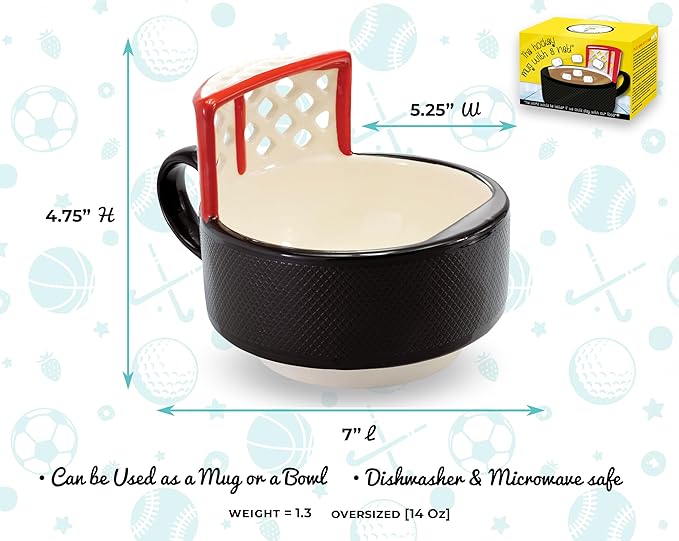 - Special Feature : All ages! Kids, teens, adults, elders, Attached net, perfect for tossing marshmallows into cocoa, cereal into milk or crackers into soup!, Perfect gift for hockey fans All ages! Kids, teens, adults, elders, Attached net, perfect for tossing marshmallows into cocoa, cereal into milk or crackers into soup!, Perfect gift for hockey fans