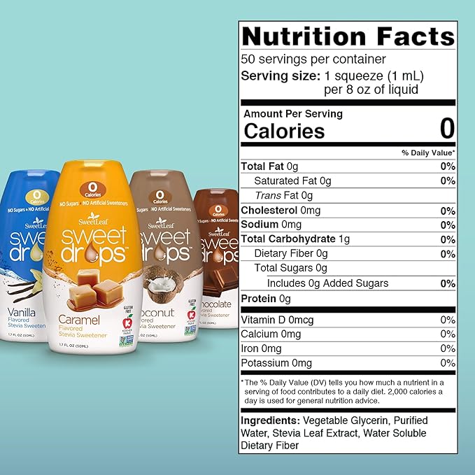 - ZERO CALORIE SWEETENER: SweetLeaf Sweet Drops deliver satisfying sweetness without added sugars. Enjoy the taste of chocolate, caramel, coconut, or vanilla with none of the calories