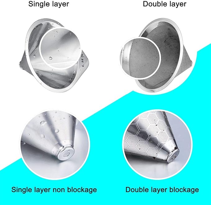 - 【TOP QUALITY】Our fine mesh stainless steel coffee filter is made of the highest quality stainless steel without using paper filters; the bottom base will stay on and not break; the extra fine wire mesh at the lower part of the filter ensure no grounds end up in your cup.
