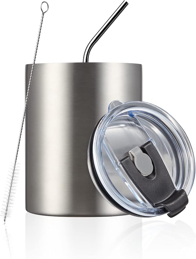 MEWAY 12 oz Lowball, Tumbler Stainless Steel Double Wall Vacuum Insulated Mug with Straw and Lid, Cleaning Brush ,Durable Powder Coated Insulated Coffee Cup for Cold & Hot Drinks (Silver, 1 Pack)