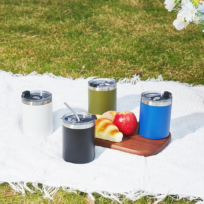 MEWAY 12 oz Lowball, Tumbler Stainless Steel Double Wall Vacuum Insulated Mug with Straw and Lid, Cleaning Brush ,Durable Powder Coated Insulated Coffee Cup for Cold & Hot Drinks (White,4 pack)