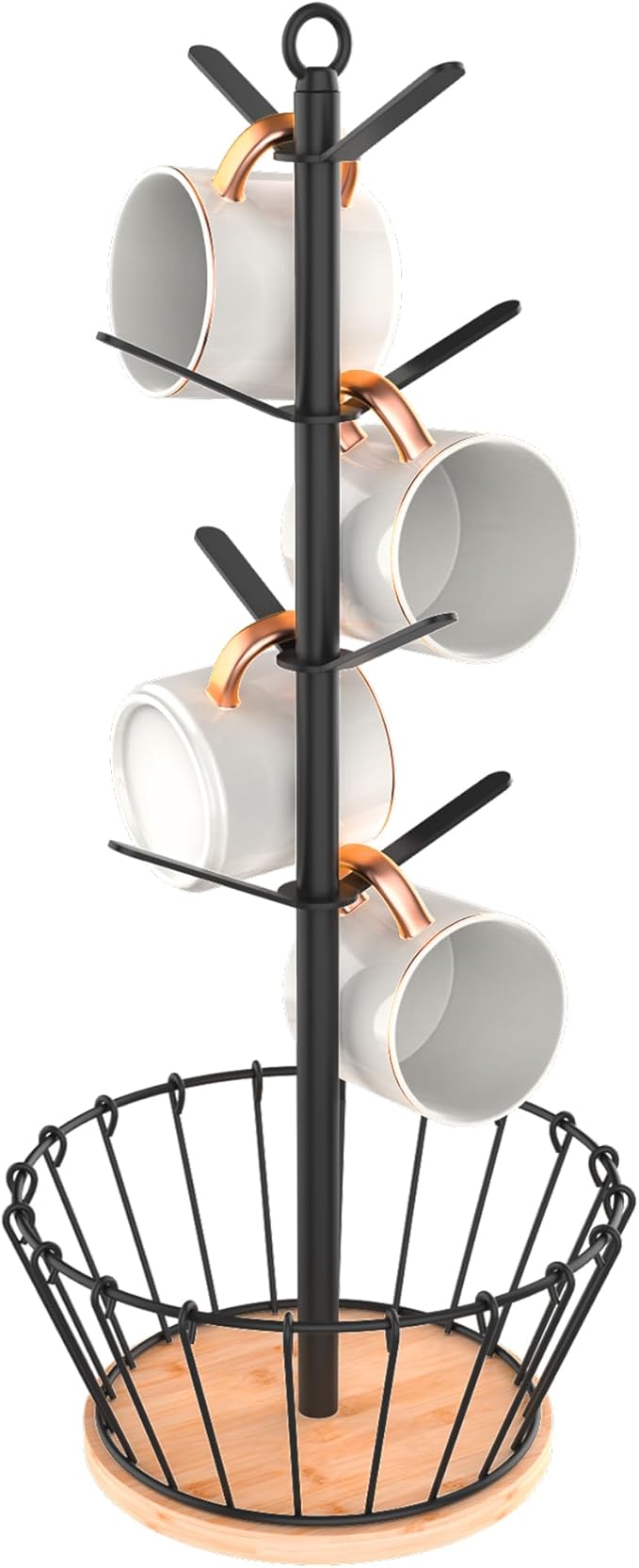 - 【 Large Capacity Coffee Mug Holder】- Perfect combination of mug hooks and coffee basket.Basket is perfect for storing your favorite coffee pods or creamer.8 Mug holder hooks for holding drink ware for easy access.coffee basket Bottom diameter 6.7inch, Height 3 inch.