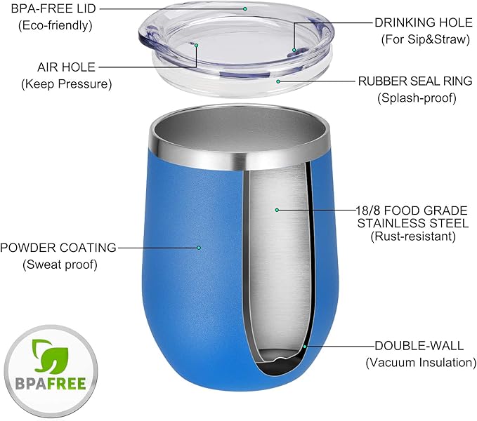 - Fashionable and Reusable: The 12oz wine tumbler bulk are made of 18/8 food grade stainless steel with non-slip frosted coating,no metallic taste. It has an eye-catching and fashionable appearance and is more solid and safer than other ordinary glasses. It is equipped with a BPA-free lid And the reusable plastic straw can be selectively used for more drinks