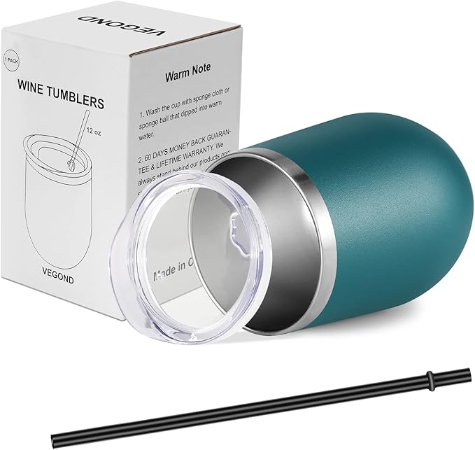 VEGOND 12oz Stainless Steel Wine Tumbler with Lid and Straw, Double Wall Vacuum Insulated Stemless Wine Glass Tumbler Cup, Coffee Mug for Cold Hot Drinks