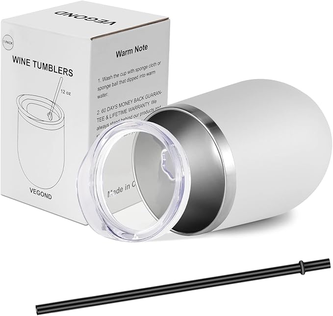 VEGOND 12oz Stainless Steel Wine Tumbler with Lid and Straw, Double Wall Vacuum Insulated Stemless Wine Glass Tumbler Cup, Coffee Mug for Cold Hot Drinks