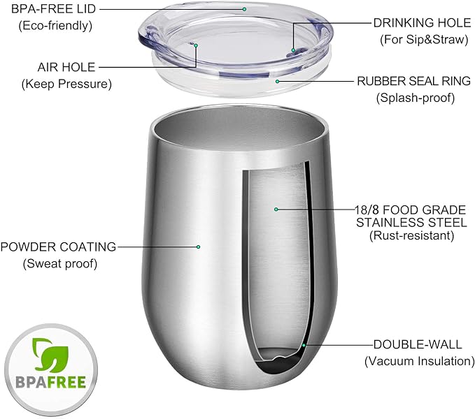 - Fashionable and Reusable: The 12oz wine tumbler bulk are made of 18/8 food grade stainless steel with non-slip frosted coating,no metallic taste. It has an eye-catching and fashionable appearance and is more solid and safer than other ordinary glasses. It is equipped with a BPA-free lid And the reusable plastic straw can be selectively used for more drinks