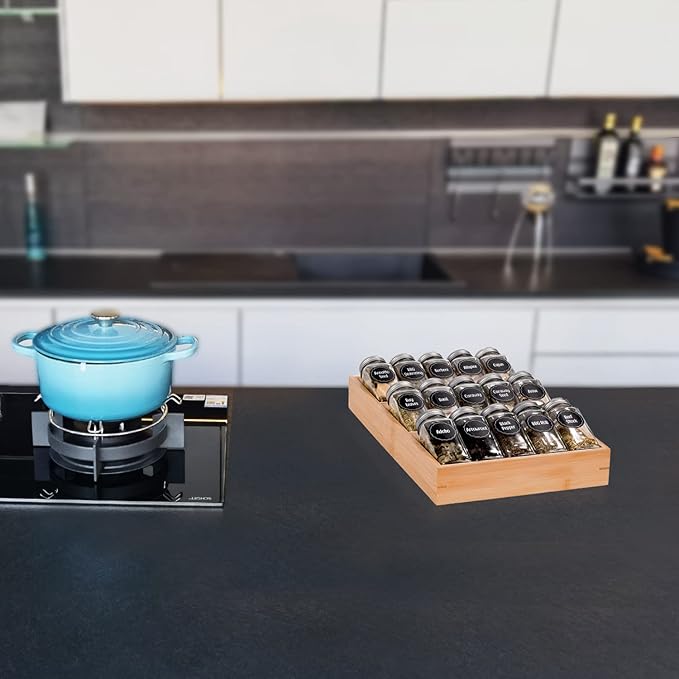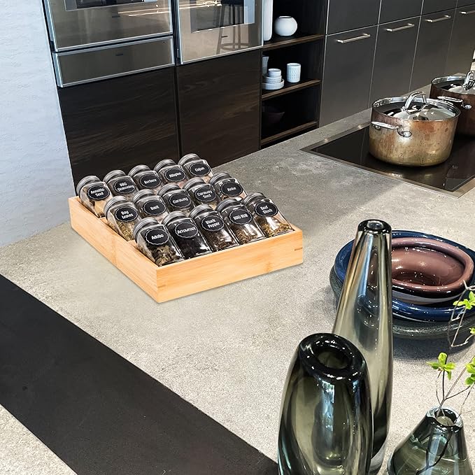 - 🌴More Use: Suitable for spice bottles & jars, drink, sauces, jelly jars, vitamin and medicine bottles. The bamboo spice rack also can organize essential oils, cosmetics, lipstick, nail polish and perfumes.