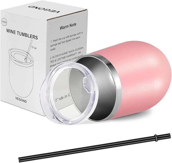VEGOND 12oz Stainless Steel Wine Tumbler with Lid and Straw, Double Wall Vacuum Insulated Stemless Wine Glass Tumbler Cup, Coffee Mug for Cold Hot Drinks