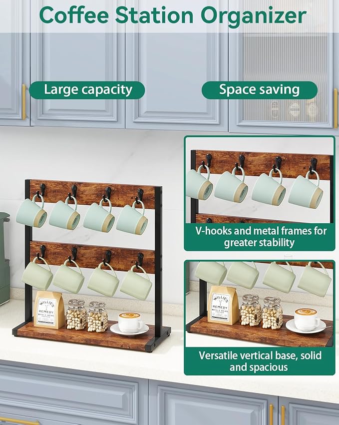 - RUSTIC MINIMALIST DECOR: The countertop coffee mug holder stand with simple and elegant industrial design create a farmhouse vibe to your kitchen, sitting room, coffee bar, tea room. Flexible desktop placement as you wish, which is perfect fit for kitchen countertops or dining table space and adds more convenience and style to your home life.