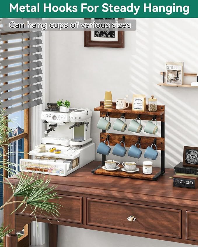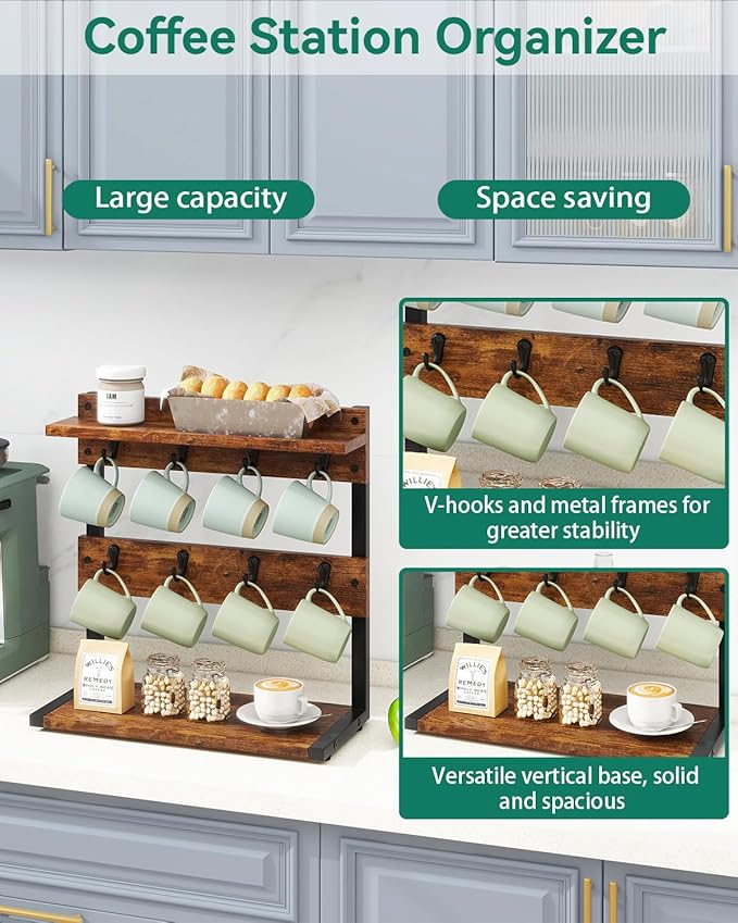 - RUSTIC MINIMALIST DECOR: The countertop coffee mug holder stand with simple and elegant industrial design create a farmhouse vibe to your kitchen, sitting room, coffee bar, tea room. Flexible desktop placement as you wish, which is perfect fit for kitchen countertops or dining table space and adds more convenience and style to your home life.