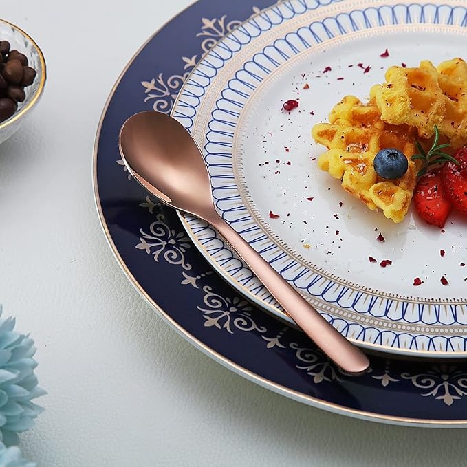 - 【Luxury and High Quality Finish】: These copper Small Spoons are polish with mirror finish and plating with titanium rose gold. Looks luxury and beautiful. The rose gold titanium plating would protect the surface of silverware from scrath. Food grade material healthy for daily use.