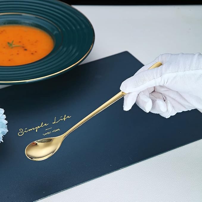 - 【Luxury and High Quality Finish】: These gold Long Handle Spoon are polish with mirror finish and plating with titanium gold. Looks luxury and beautiful. The gold titanium plating would protect the surface of silverware from scrath. Food grade material healthy for daily use.