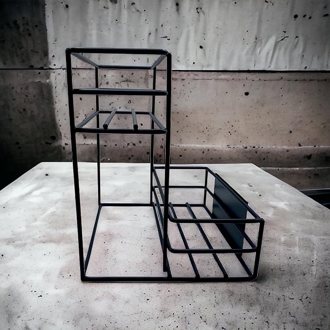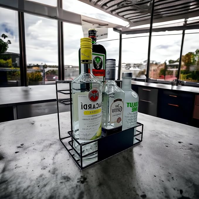 - Perfect size bottle caddy, 2 tiered large ladders, 10 x 7.3 x 8.8 inches, unlike other bottle holders this drink bottle organizer fits everywhere! You can place it in a small cabinet or decorate your kitchen countertop, its design allows it to fit and decorate every type of environment, its hardened durable black iron steel metal fits esthetically in any room, thanks to this bottle holder you can organize your bar and save space for more kitchen and bar supplies