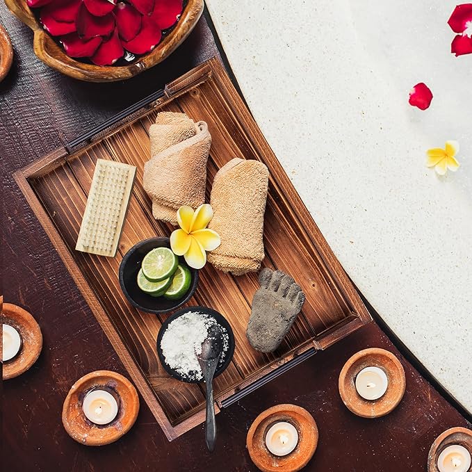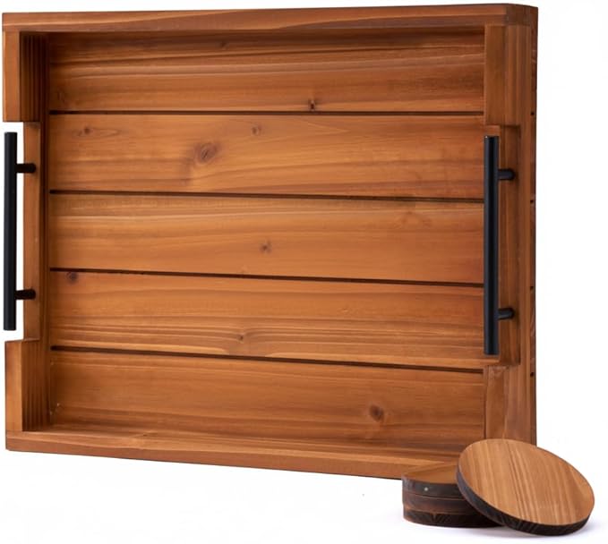- INCLUDED WOODEN COASTERS SET OF 4 – Along with our wooden serving trays, we also provide a set of 4 natural wooden coasters that have a tasteful torched appearance. These wooden coasters for drinks are the best way to protect your tables from spills, mess, and stains while also adding a decorative element to your home, uplifting the overall aesthetic appeal – MUST HAVE ottoman tray with handles can be used as a Drink Tray!
