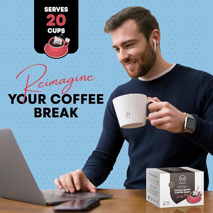 Mondo Single Serve Coffee Bags (20 Cups) Variety Pack - Organic, Medium Roast - Disposable, Portable Coffee Filters for Camping and Travel, Sampler Box of 5 Ground Coffee Flavors