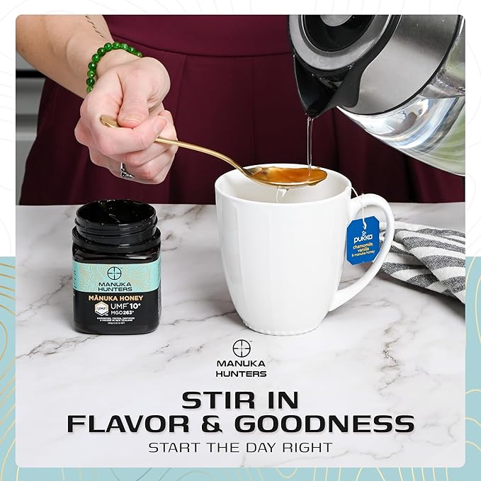Manuka Hunters UMF 10+/MGO 263+ Certified New Zealand Manuka Honey - 100% Pure Natural Sweetener - Gluten, Dairy Free - Ideal for Tea, Coffee, Smoothies, and Baking - Sustainable - 8.8oz/250g Jar