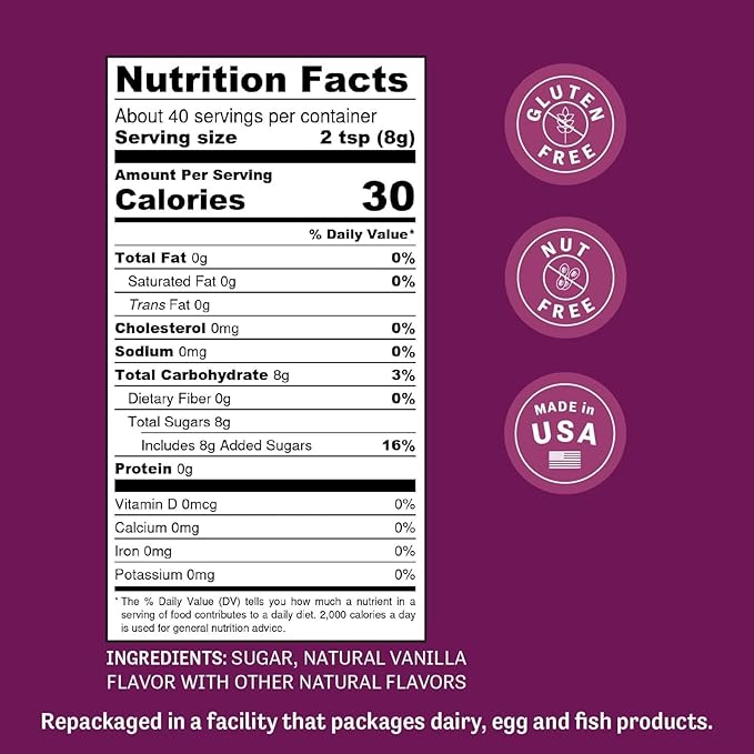 - Ingredients: Sugar, Natural Vanilla Flavor with Other Natural Flavors