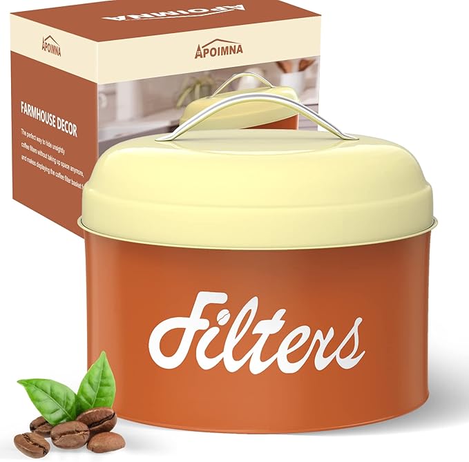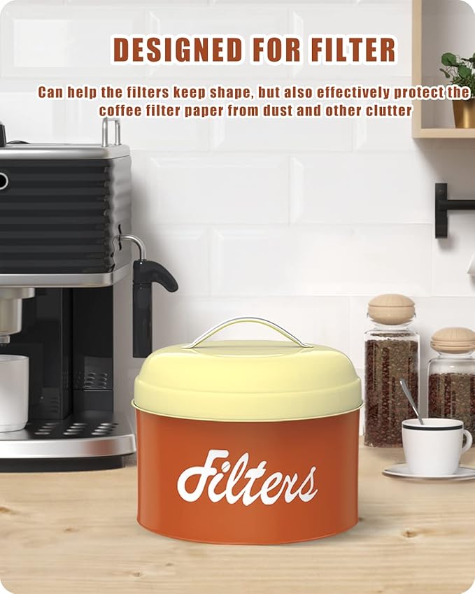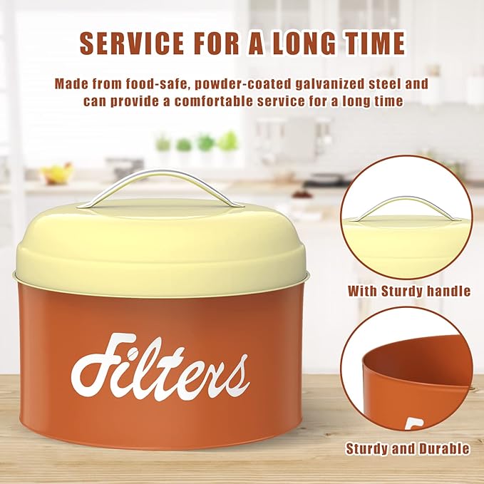 - STURDE & DURABLE COFFEE FILTER CONTAINER : Our coffee filter holder storage made of powder-coated galvanized steel, sturdy, not easy to break and deform, which can provide you a comfortable service for a long time. The smooth interior and surface are very easy to clean, just wipe with a damp cloth. Comes with a lid to keep the filter away from dust, moisture and other clutter