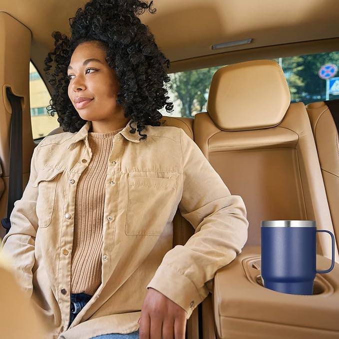 - Cupholder Friendly: The travel coffee tumbler 20oz is designed with a tapered shape which fits most car cup holders, equipped with a sturdy handle that allows easy carrying. Diameter 3.38" large cup mouth makes it easier for you to clean the stainless steel mug