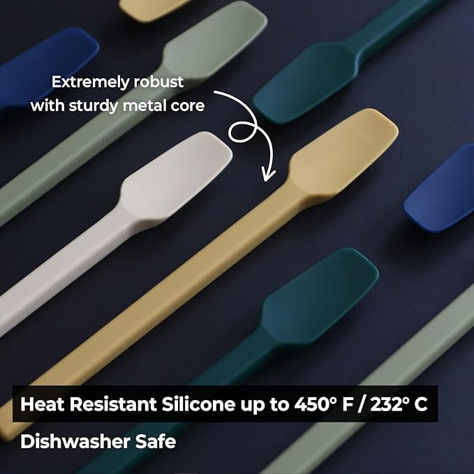 - High quality, heat resistant, sturdy silicone spoon available in 5 calming retro colors (Deep Green, Navy, Mustard, Olive Green, Ivory). Measures 7.3” long & 0.9” wide.