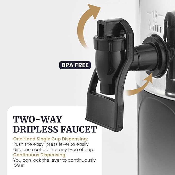 - CONVENIENT 2-WAY DISPENSING: Allows guests to fill one single cup with a quick flip of the lever. Or flip the lever completely down to continuously fill a larger carafe.