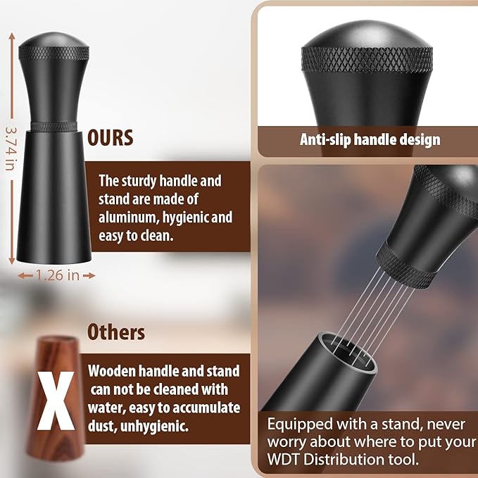 - 【Needles Removable as you like】 Unlike many other espresso tools, our espresso distribution tool can be easily assemble/disassemble, you can insert as many 3/4/5/6/7 needles as you need
