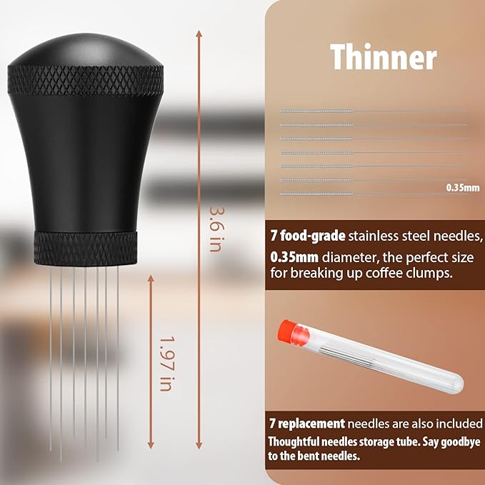 - 【Thinner 14 Needles】 Needles evenly distributed design. 7 food-grade stainless steel needles, 0.35mm diameter, the perfect size for breaking up coffee clumps, plus 7 replacement needles. Thoughtful needles storage tube. Say goodbye to the bent needles