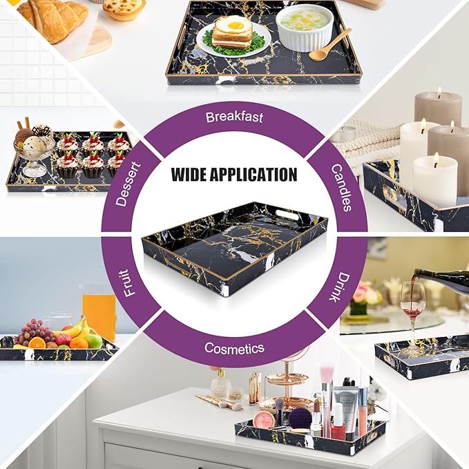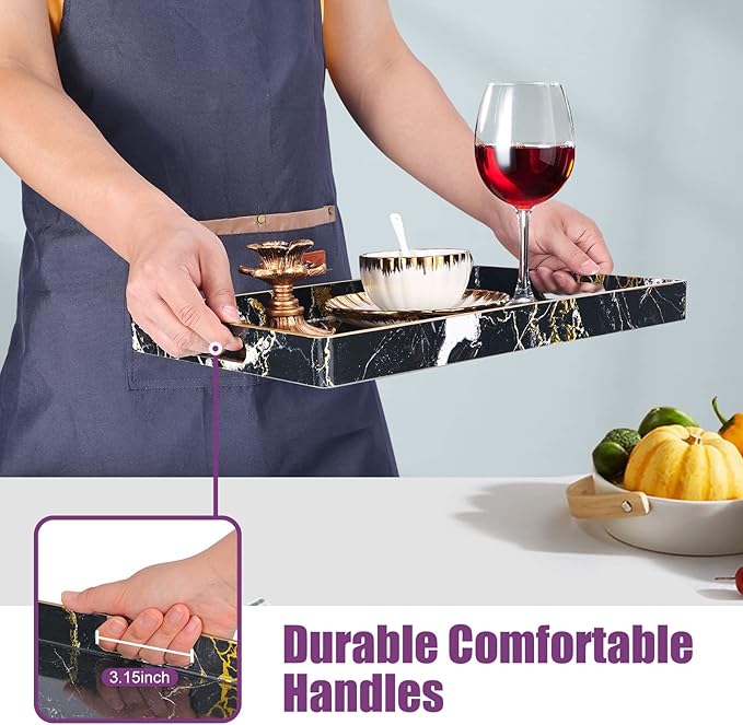 - 【Multipurpose Serving Trays】Designed for display and storage, this black marble serving tray can be used as a decorative tray, makeup tray, jewelry tray, service tray and desktop organization tray.This serving tray can also be used as a storage box for small items such as keys or TV remote controls. Also perfect for serving snacks, breakfast lunch or dinner.