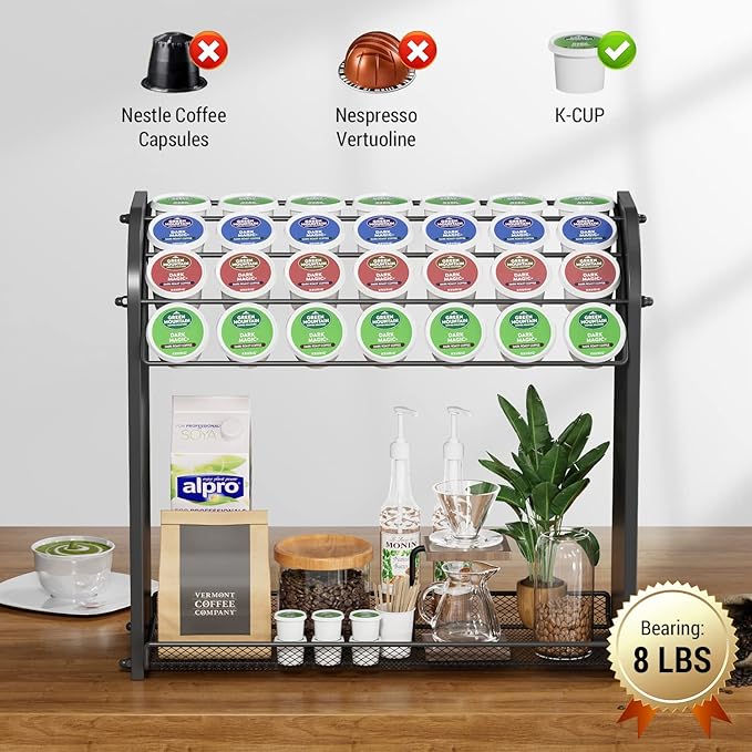 - Large Storage Capacity Coffee Pod Organizer: Our K cup holder not only holds up to 28 k cups at 4 rows on top, also keeps your coffee bar accessories like stir sticks, coffee syrups, sugar or tea supplies ready to hand from bottom tray as a coffee station organizer for countertop