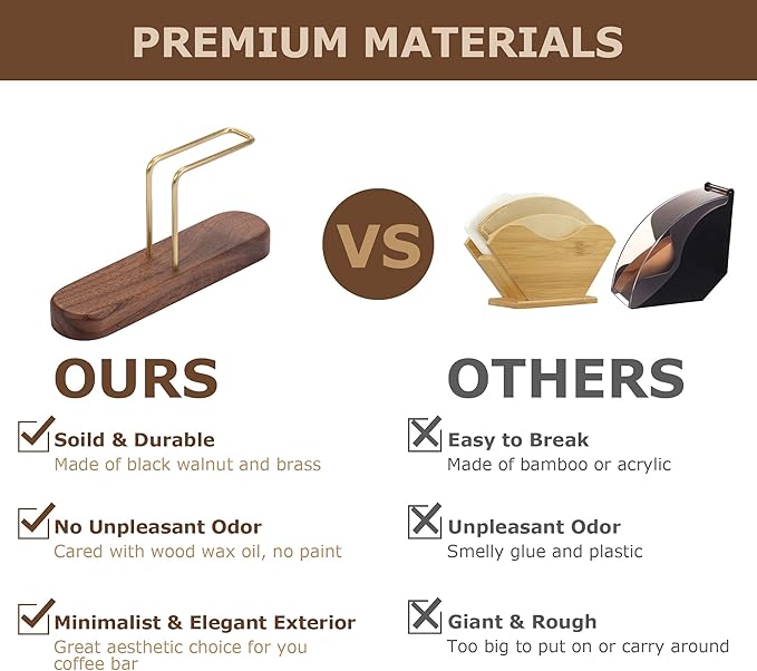- PREMIUM BLACK WALNUT BASE & BRASS RACK: PUNNIO coffee filter holder storage is composed of a wood base and a brass rack. The base of our coffee filter holder is made of raw black walnut wood, unpainted but cared with natural wood wax oil which is no weird odor. This combination of materials ensures our coffee filter holder storage is solid, durable, and long-lasting.