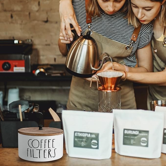 - Rustic Farmhouse Style - The perfect way to hide unsightly coffee filters without taking up space anymore, complements any countertop decor, matches your coffee bar. Classic white color and black letter "filters" match for a rustic vintage style for your coffee filter. This coffee filter container are made by hand, which means each piece will be unique.