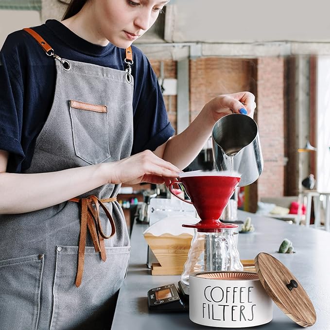 - Convenient to use - The top of the wooden lid has a wood handle, which adds aesthetics and is easy to open when in use. The round can be placed anywhere near the coffee machine, on the counter or on a shelf, it is easier to reach than a wall-mounted coffee filter holder and saves you brewing time! Except filters, you can also store other small items in the rustic container with lid, like coffee beans, sugar.