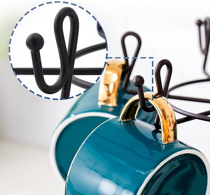 - [Compact Size for Limited Space] Countertop mug tree stand perfect for coffee counter, bar, cabinets, kitchen organizer, tabletop. Sleek design of 6 hooks cup drying rack saves space and frees up counter and drawer space.