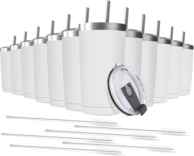 12 pack 20 oz Stainless Steel Insulated Tumbler with Straw and Lid, Double Wall Travel Coffee Mug Vacuum Insulated Bulk Tumbler, Suitable for Vehicle Cup Holders (White)