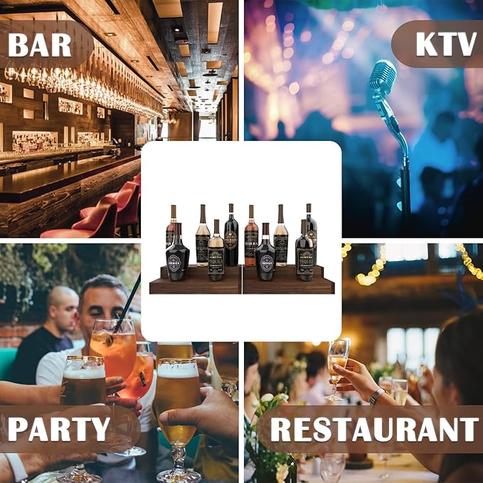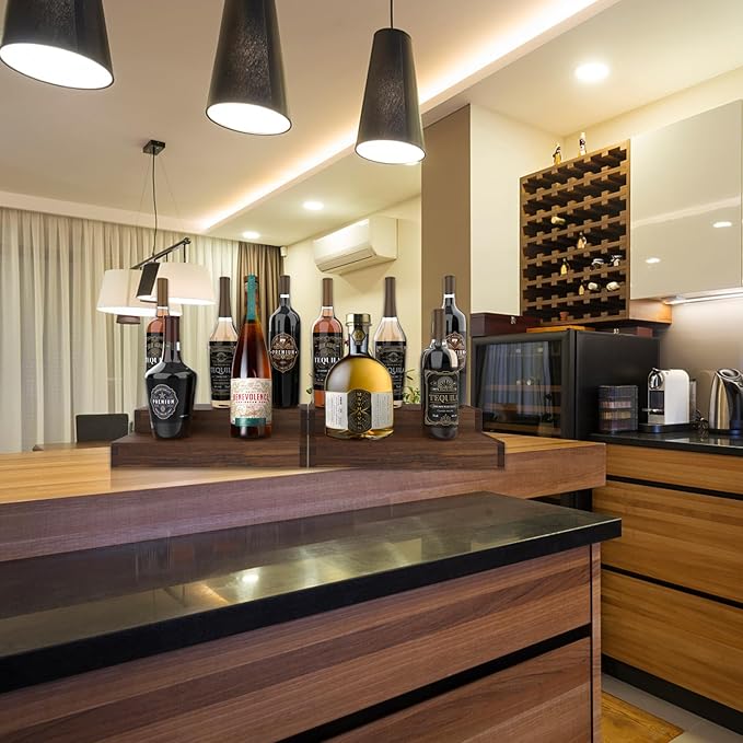 - SUITABLE FOR MULTIPLE OCCASIONS: This solid wood liquor shelf features a unique two-tier design that can meet all your wine collection display needs. Its large capacity allows you to easily and quickly find the wine you need. Additionally, this two-tier display rack is also ideal for showcasing your perfume, cologne, collectibles, baked goods, and any other items you want to display.