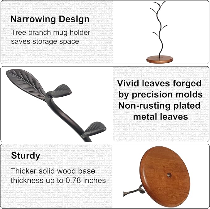 - 【STYLISH & ELEGANT】- This coffee mug holder stand inspires an up-to-date look that is fresh and contemporary.Simple leaf shape paired with classic wood base creates a traditional appearance with a modern flair,sleek and stylish design make it become an elegant artist ornament on your table and the ultimate coffee station organizer.