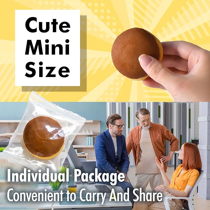 - MINI SIZE, INDIVIDUALLY WRAPPED – Each dorayaki is a cute mini size, perfect for enjoying in 2–3 bites. They’re individually wrapped for convenience, making them ideal for on-the-go snacking, lunchboxes, or a sweet treat during the day.