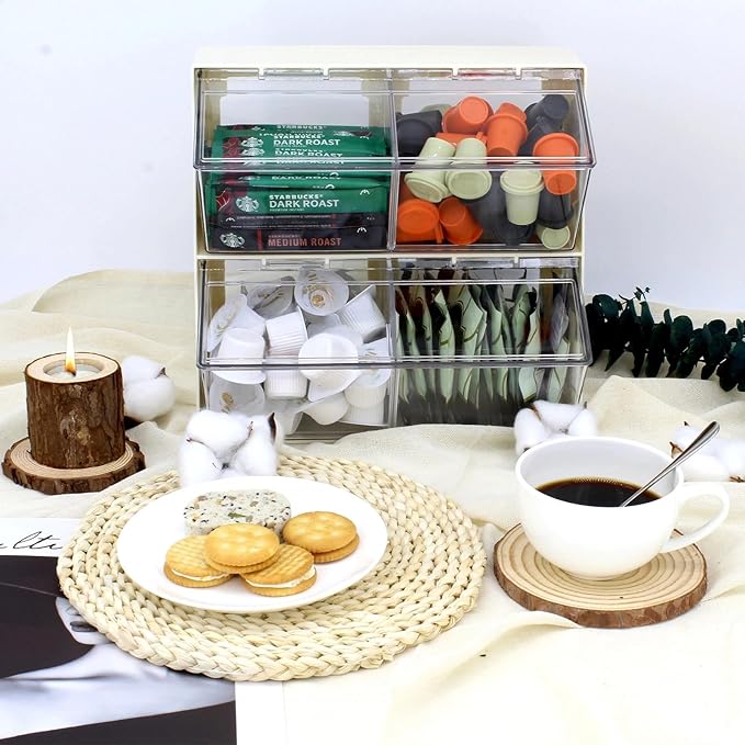 - Save Space & Large Capacity --- Our coffee pod holder with 4 large capacity storage partitions for k cups, tea bags, sugar, creamer etc. This storage caddy saves countertop space and makes organising easy and simple! Whether used individually or stacked, it provides ample storage space to accommodate your high-capacity storage requirements. Idea for small coffee bar accessories in the coffee station, counter, drawer and cabinet use.Everything is easy to find in the clear drawers.