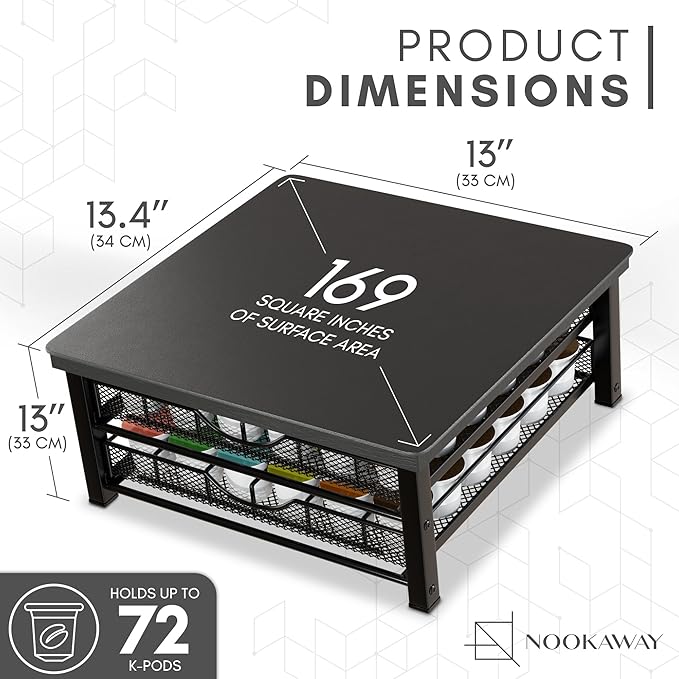- TRANSFORM YOUR COFFEE CORNER with the Nookaway Keurig Coffee Pod Organizer. This K Pod holder features an elegant black wood top and black metal frame, turning a simple coffee corner into a chic and sophisticated area