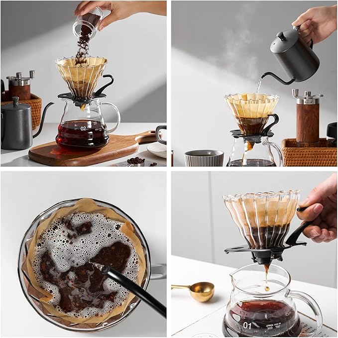SuperCook Hand Drip Pour Over Coffee Set, All in One Includes Gooseneck Kettle, V60 Glass Dripper, Paper Filter, Cups, Manual Grinder, Scale, Ideal for Anniversary Birthday Gift