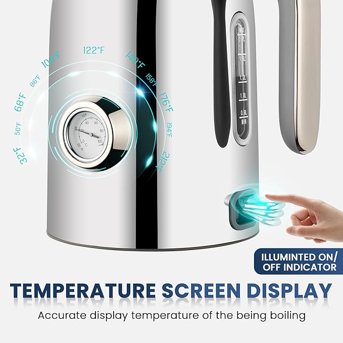 SUSTEAS Electric Kettle - 57oz Hot Tea Water Boiler with Thermometer, 1500W Fast Heating Stainless Steel Pot, Cordless LED Indicator, Auto Shut-Off & Boil Dry Protection, Silver