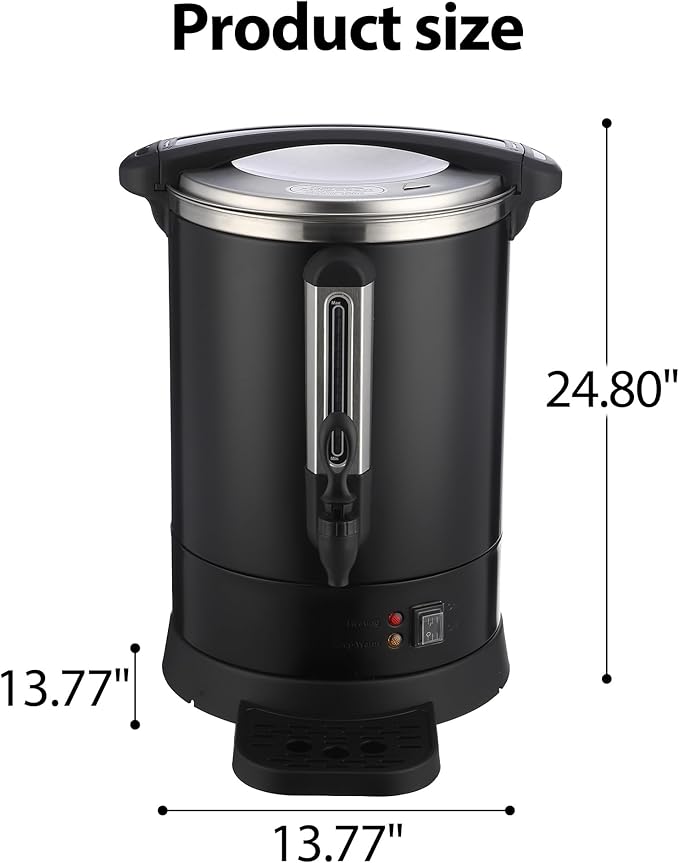 - [Rapid Heating]:1500W double heating tube design that can heat 120 cups of coffee in 30 minutes. The shell is made of 403 steel, with good heat insulation, you do not have to worry about hand burns.Voltage-220-240V/ 50HZ.
