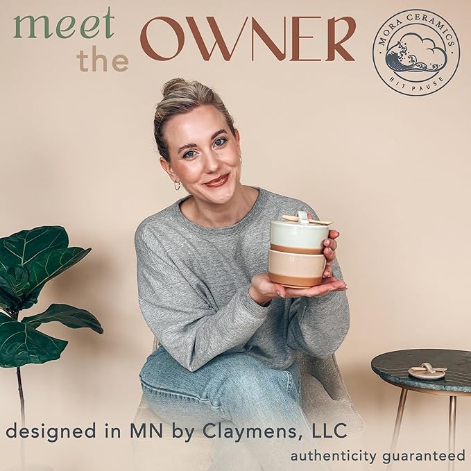 Mora Ceramic Salt and Pepper Cellar Set with Lid - 10 oz Modern Canister/Container/Bowl for Storage, Sea Salt, Spice, Sugar, Countertop - Small Dish/Jar with Wood Spoon, Matcha & Chai Crock