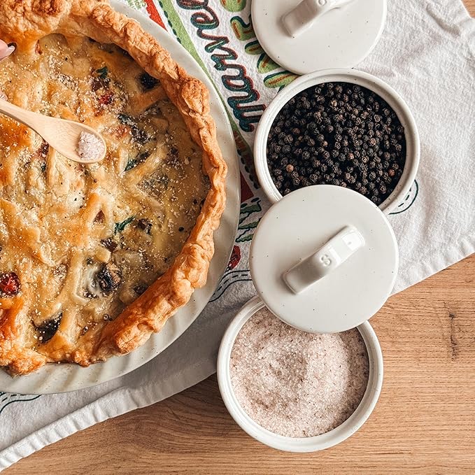 Mora Ceramic Salt and Pepper Cellar Set with Lid - 10 oz Modern Canister/Container/Bowl for Storage, Sea Salt, Spice, Sugar, Countertop - Small Dish/Jar with Wood Spoon, White Crock