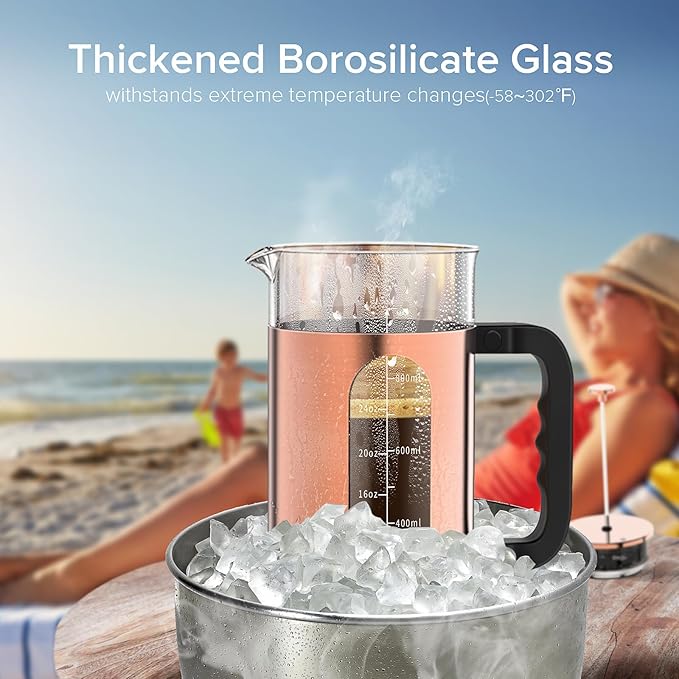 - 【EASY TO USE】Brew a cup of coffee in several minutes. The 34oz/1000ml french press makes the perfect cup of coffee. The french press coffee is the easiest to concentrate on the condition of the beans among the many devices. You can see the amount of foam (crema) after the coffee touches the water, and how the coffee floats on the water and slowly sinks