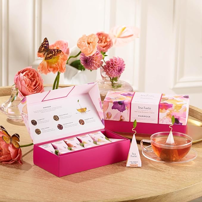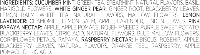 - MARIPOSA COLLECTION, an exquisite tea collection features lush, fruity flavors and floral aromas; each vibrant blend inspires happiness, harmony, and rejuvenation: Cucumber Mint (Green tea), White Ginger Pear (White tea), Lemon Lavender (Herbal tea), Raspberry Nectar (Herbal tea), and Pink Papaya Nectar (Herbal tea).