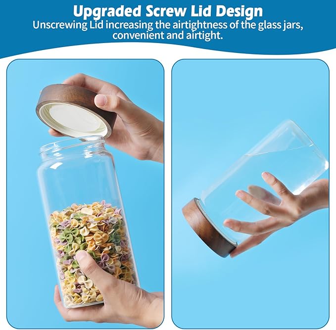 - 【WIDE APPLICATIONS】Glass canning jars storage are suitable for storing various dried ingredients to retain their freshness.Glass jars with wood lids perfect for storing dry food , such as,cookies,dried beans,liquid,pepper,oatmeal,jams,chutneys, rice, flour, tea, coffee, biscuits, candy,cheese,flour, sugar, seeds,etc. Keep your kitchen tidy and safe,saving space and convenient .