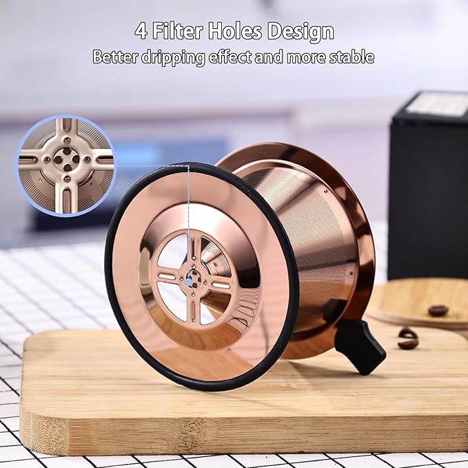 - 【SPECIFICATION and MATERIALS】Upper Diameter is 4 IN, Under Diameter is 4 IN, Height is 2.76 IN,double-mesh stainless steel coffee filter is made of 304 food-grade stainless steel, with fine filtration and does not use any paper filters; the double-layer filter of the filter can better filter coffee grounds, and the 4-hole design on the lower part of the filter , better make coffee drip in the coffee container